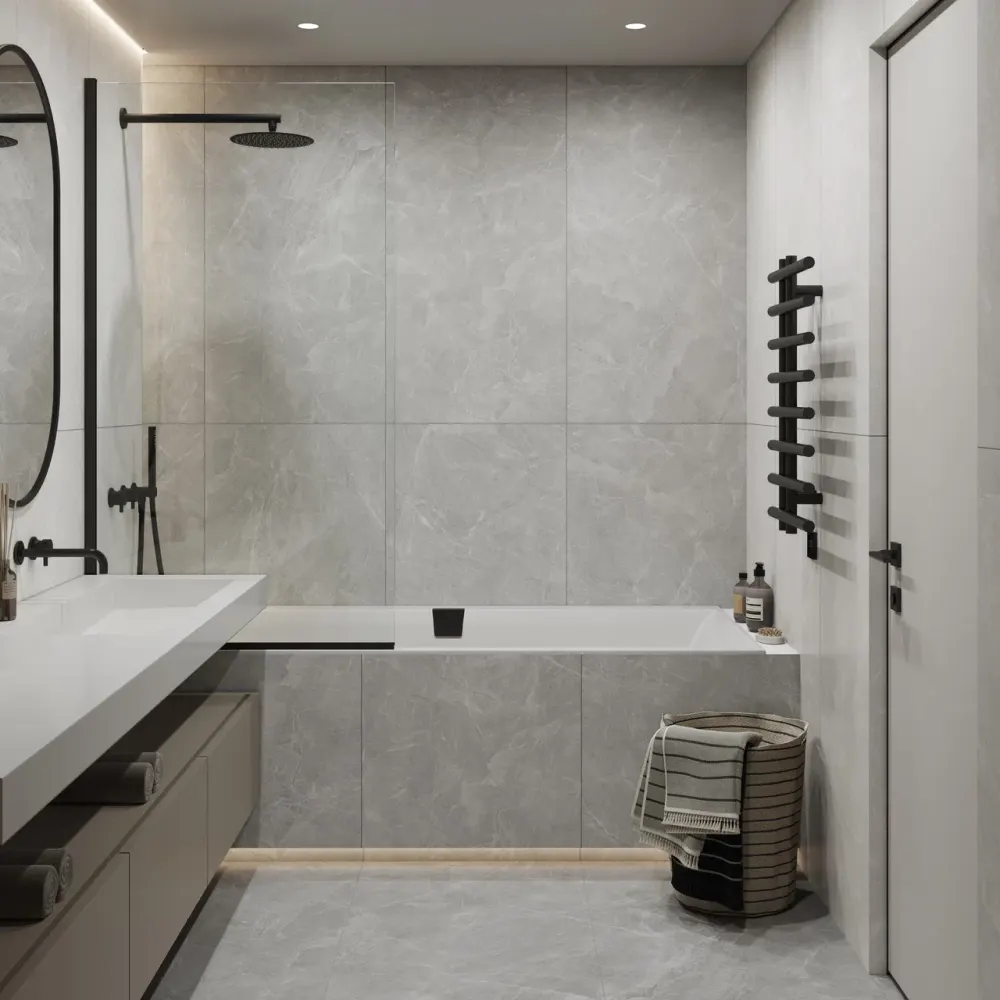 Ванная — чемпион по сложностям. Здесь редко бывает простая форма: наверняка есть ниши, короба, выступы, инсталляции. Поэтому расчет лучше делать не для общей площади, а разбить помещение на отдельные участки. Каждая стена считается отдельно, с учетом всех вырезов. Если планируется декоративная часть — например, панно, вертикальная вставка или акцентный ряд — ее нужно считать отдельно от основного фона. Иначе можно ошибиться в пропорциях.