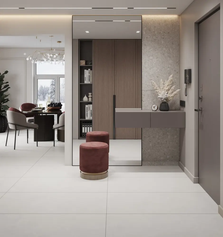 Это зоны с высокой проходимостью, поэтому выбирать стоит износостойкий материал. Иногда разумнее увеличить запас, особенно если укладка выполняется со смещением. Тем более что прихожая — самая нагруженная часть квартиры, и в будущем может потребоваться замена одной или нескольких поврежденных плиток.